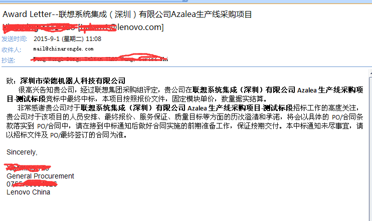 很高興告知貴公司,經(jīng)過聯(lián)想集團(tuán)采購組評定,貴公司在聯(lián)想系統(tǒng)集成(深圳)有限公司Azalea生產(chǎn)線采購項(xiàng)目-測試標(biāo)段競標(biāo)中最終中標(biāo),本項(xiàng)目按照報(bào)價文件,固定模塊單價,數(shù)量據(jù)實(shí)結(jié)算。
