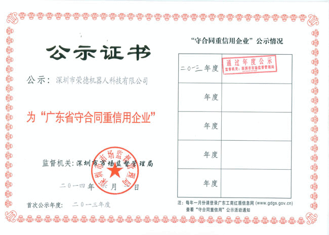 在此之際,非常感謝廣大客戶朋友對公司的認可和滿意,只有客戶對公司的認可,這樣公司合同才能夠嚴格履行,最終才能獲得該榮譽稱號。全體榮德人將會以此為契機,將產(chǎn)品質(zhì)量和服務(wù)做到行業(yè)內(nèi)一流水平,滿足并不斷超越客戶需求。同時也請客戶放心選購我司的噴涂機器人、自動噴涂設(shè)備、自動化生產(chǎn)線,獲得“廣東省名牌產(chǎn)品”的“守重企業(yè)”值得您的信賴,我們將會以最優(yōu)質(zhì)的質(zhì)量回報客戶、回報社會,為深圳質(zhì)量的發(fā)展乃至全國質(zhì)量的發(fā)展貢獻自己的力量!