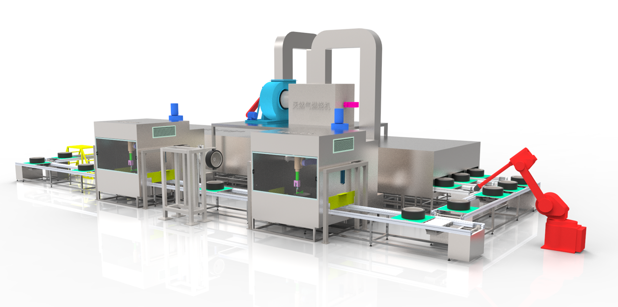 橡膠輪胎機(jī)器人自動噴涂線是根據(jù)用戶的產(chǎn)品特點及要求設(shè)計,用于輪胎的噴涂、烘干等工序,產(chǎn)品采用工裝式滑撬線輸送,機(jī)器人自動噴涂,機(jī)械手自動翻面,減少人工勞動力,提升企業(yè)自動化程度,便于管理。
