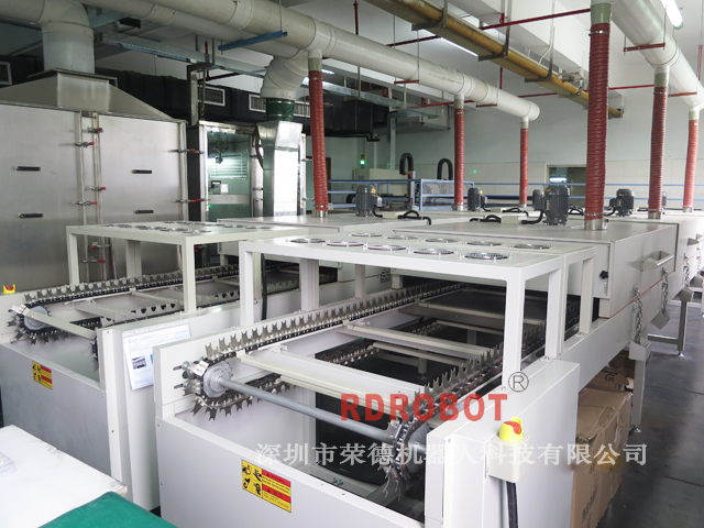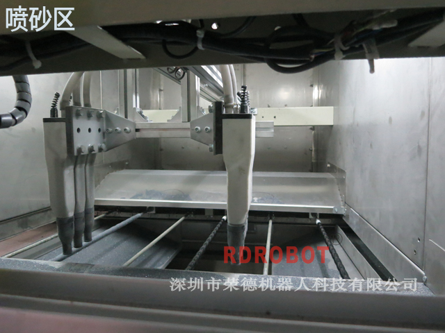 工藝流程:自動打毛→上噴膠輸送線→加熱AB膠→自動噴膠→自動噴砂→機械手自動抓取到排料線→機械手自動抓取到烘干線→烘干—冷卻—下件(非標(biāo)定制)
